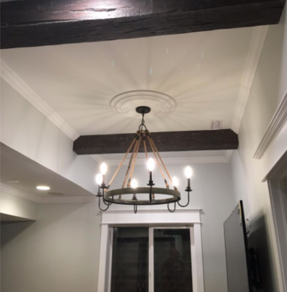 To break up a room in an open format floor plan, consider a surface mounted beam of layered wood or PVC. PVC options offer opportunities for faux painting to achieve a barn wood beam look without the need of structural installation work for a heavy, natural barn wood beam.
